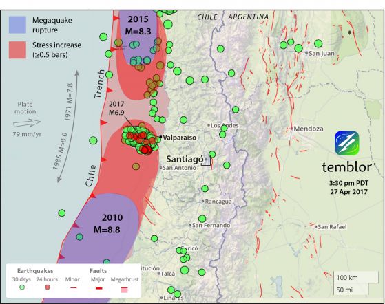Мегаземетресенията са едно от трите драматични последици от подпъхването на океанската плоча Наска под плочата на Южна Америка, един процес, наречен "субдукция". Втората последица от това явление е натискът и издигането на Андите, а третата е веригата тихоокенски вулкани. Чилийското крайбрежие претърпя многократно мощни трусове за последните 500 години откакто се записват. Най-голямото земетресение, регистрирано някога, е с магнитуд М = 9.5 през 1960 г. и е било на 570 км на юг от Сантяго в южната част на Чили.