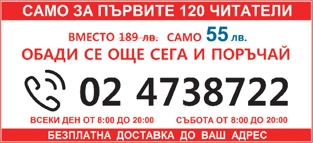 ВАЖНО! Само първите обадили се 120 души ще получат продукта на професор Пике вместо 189 лв., само за 55 лв. – опаковка, достатъчна за едномесечен курс на ползване. Осигурена е и безплатна доставка до Ваш адрес!