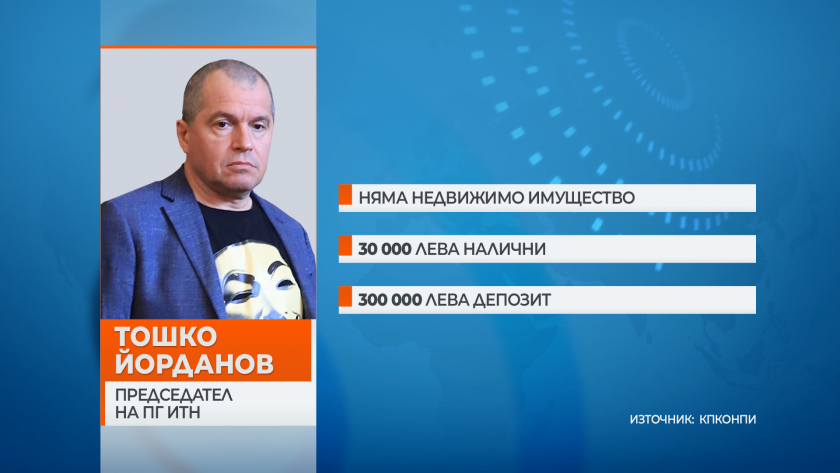 Председателят на ПГ на "Има такъв народ" Тошко Йорданов не е декларирал недвижимо имущество. Той обаче разполага с депозит от 300 000 лева и 30 000 лева налични средства.