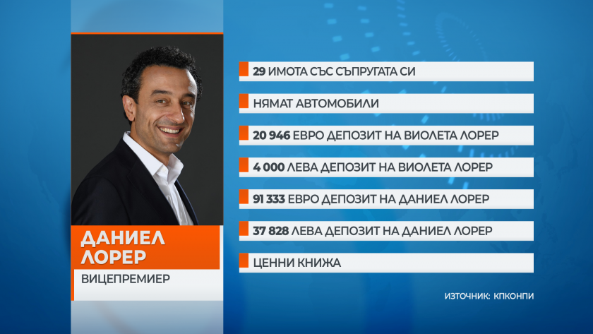 Сред министрите с много имоти са още вицепремиерите Даниел Лорер и Бойко Рашков. Лорер, заедно със съпругата си Виолета, която е шеф на кабинета на финансовия министър, имат 29 имота. Двамата разполагат със сметки както у нас, така и в чужбина. Виолета Лорер има над 20 000 евро депозит навън и 4000 лева у нас. Съпругът ѝ разполага с 91333 евро спестявания зад граница и над 37 000 лева у нас. Лорер е собственик и на ценни книжа.