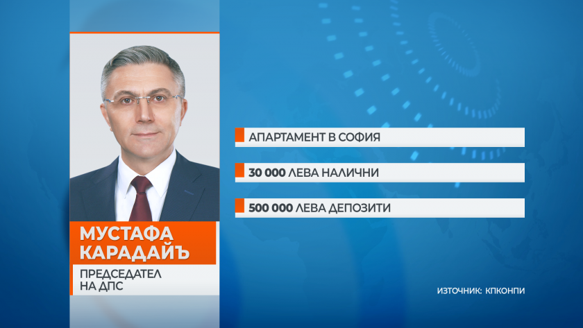 Лидерът на ДПС Мустафа Карадайъ има апартамент в София, 30 000 налични средства и 500 000 лева депозит.
