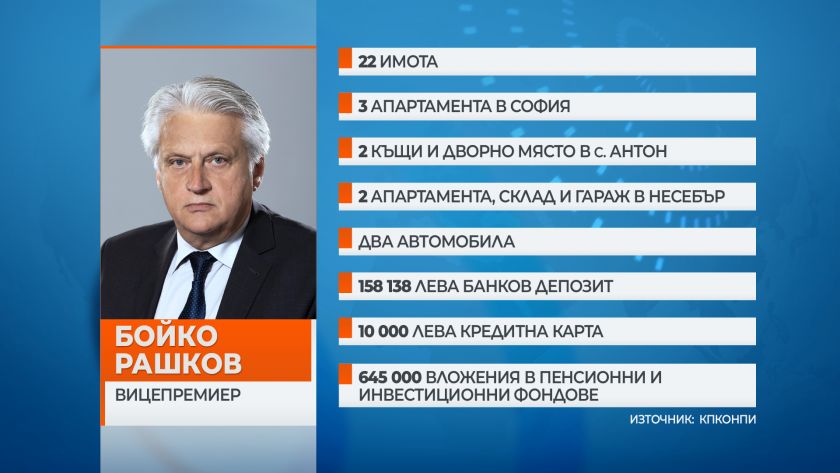 Силовият министър Бойко Рашков има 22 имота. Сред тях са три апартамента в София, две къщи и двор в село Антон и два апартамента в Несебър. Рашков също така е собственик на два автомобила и има 645 000 лева вложения в пенсионни и инвестиционни фондове. Също така разполага с кредитна карта с лимит 10 000 лева и банков депозит за 158 138 лева.