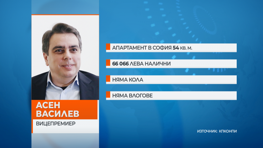 Вицепремиерът Асен Василев има малък апартамент в София с площ 54 кв. м. Той няма кола, няма и влогове. Наличните му средства възлизат на 66066 лева.