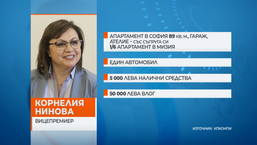 Вицепремиерът Корнелия Нинова има заедно със съпруга си апартамент в София, гараж и ателие. Също така е собственик на 1/6 от апартамент в гр. Мизия, има и един автомобил. Нинова разполага с 5000 лева налични средства и депозит за 50 000 лева.