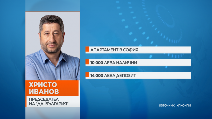 Председателят на "Да, България" Христо Иванов също има апартамент в София, 10 000 лева в брой и 14 000 лева влог.