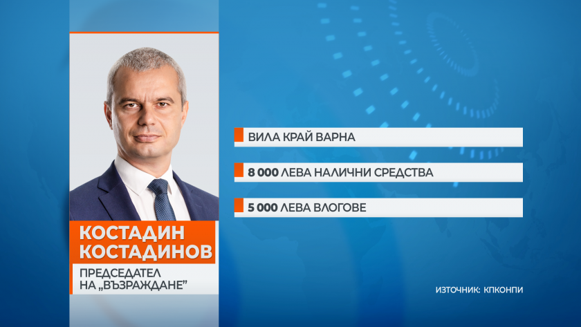 Костадин Костадинов, лидер на "Възраждане", разполага с вила край Варна, 8000 лева налични пари и 5000 лева влог.
