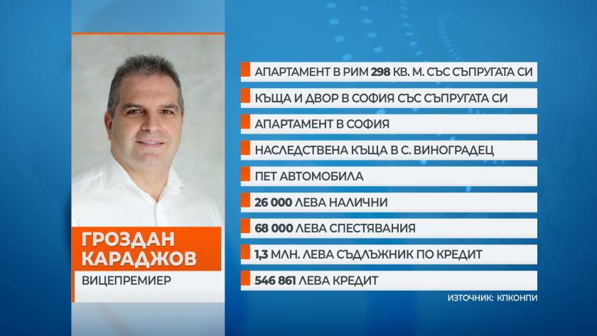 Сред управляващите с най-големи кредити е вицепремиерът Гроздан Караджов. Той е съдлъжник по кредит от 1,3 млн. лева заедно със съпругата си. Също така има и заем за 546861 лева. Отделно Караджов обаче разполага с апартамент в италианската столица Рим от 298 кв. метра. В София семейство Караджови имат апартамент и къща с двор, както и наследствена вила в село Виноградец. Домакинството разполага и с пет автомобила. Наличните средства на вицепремиера са 26 000 лева, а спестяванията - 68 000 лева.
