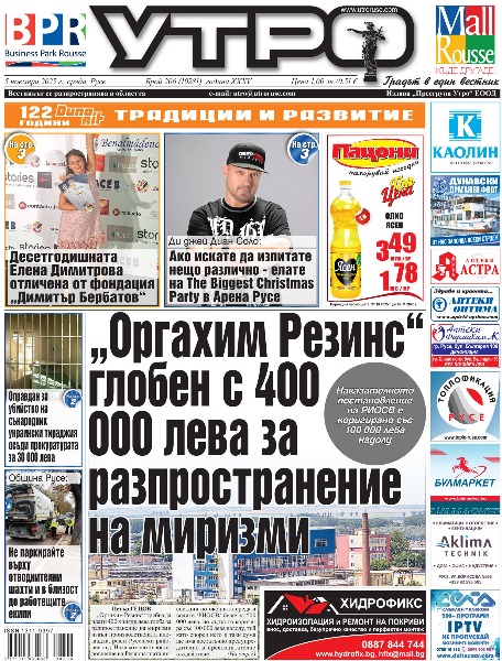 5 ноември 2025 г. - „Оргахим Резинс“ глобен с 400 000 лева за разпространениe на миризми * Оправдан за убийство на сънародник украински тираджия осъди прокуратурата за 30 000 лева * Ди джей Диан Соло: Ако искате да изпитате нещо различно - елате на The Biggest Christmas Party в Арена Русе * Община Русе: Не паркирайте върху отводнителни шахти и в близост до работещите екипи * Кандидатите за „Арт кафе“ ще наддават от 1428 лева начална месечна цена * Изляха 75 тона бетон на Дунав мост * Гледна точка - Един екип с кола за по-малко от 50 000 лева за ден ще свърши по-добра работа от паяк за 250 000 за седмица * Десетгодишната Елена Димитрова отличена от фондация „Димитър Бербатов“ * Книгите на Нико Просеничков - огледало на един ерудиран, честен, отговорен човек и учител * „От дълбока древност“: в Русе ще бъде представен непознатият Хенрик Сенкевич * „Булмаркет“ алармира за фалшив сайт с обещания за нереални печалби * След разгрома на „Янтра“ задачата пред „Дунав“ е победи в следващите два кръга * Тези и още новини в новия брой на „УТРО“.