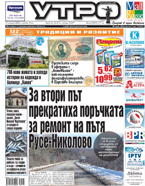 21 януари 2026 г. - За втори път прекратиха поръчката за ремонт на пътя Русе-Николово * 796 нови живота и хиляди истории на надежда в болница „Канев“ * Ники Кънчев и Гери Турийска на русенска сцена - любов, страст и човешки истории през февруари * Течове, влага, повреден покрив - храмът „Свети Николай Чудотворец“ се нуждае от спешна подкрепа * Станаха ясни имената на русенците, обрали инкасо автамобил в Ихтиман - били студенти * Бабинден дойде с миене на ръце, песни и хора в бившия Дом „Майка и дете“ * „Асамблея на красотата и модата“ обединява фризьорско изкуство и благотворителна кауза * Русенската следа в аферата с „ботевките“ - най-голямото фалшификаторство в Царство България * Тлъста глоба за райски газ падна в съда - сочените за купувачи рязко смениха версията * 34-годишен с маска и камуфлажни дрехи размахвал газов пистолет в магазин в Русе * Грип в лагера на „Нафтата“ изпрати „Дунав“ за контролен мач в Ямбол * Двойният световен шампион и олимпийски медалист Християн Стоянов окачи бутонките * Тези и още новини в новия брой на „УТРО“.