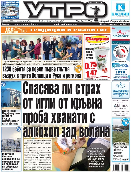 22 януари 2026 г. - Спасява ли страх от игли от кръвна проба хванати с алкохол зад волана * 1239 бебета са поели първа глътка въздух в трите болници в Русе и региона * Местният бюджет очаква над 1,5 милиона евро от продажба на общински жилища * Манол Генов: Модифицираните горива от Русе се оползотворяват извън областта * Младата международна звезда Ева Гарет преди дебюта си в Русе и България: Чувала съм прекрасни неща за русенската публика и силните музикални традиции тук, с нетърпение очаквам този концерт * Дарен от областната управа автомобил попълва автопарка на жандармерията * Майка тормозила и гонила с нож дъщеря си след дълги години имотни спорове * „Дунав“ победи „Ямбол“ с голове на Бойчев и на новото попълнение Красимир Тодоров * Тези и още новини в новия брой на „УТРО“.