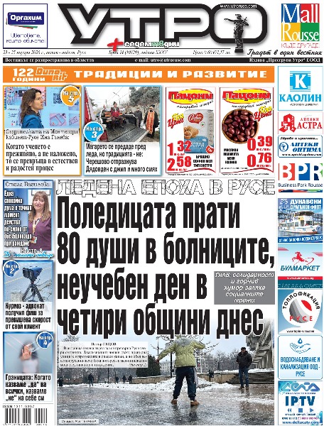 23 януари 2026 г. - Ледена епоха в Русе: Поледицата прати 80 души в болниците, неучебен ден в четири общини днес * Куриоз - адвокат получил фиш за превишена скорост от свой клиент * Магарето се предаде пред леда, но традицията - не: Черешово отпразнува Дядовден с джип и много смях * Създателката на Монтесори кабинет-Русе Ина Ганева: Когато ученето е преживяно, а не наложено, то се превръща в естествен и радостен процес * Старшата акушерка на Родилното в УМБАЛ „Канев“ Стела Василева: Една спокойна дума в точния момент действа по-силно от обезболяващо при раждане * Благотворителна репетиция в Арена Русе помага за лечението на баща на три деца * Общината продава 114 имота и придобива 21 * На този ден: Страстта като съдба и романът като лаборатория на човешката душа * Защо всяка снежинка е уникална? Науката вече знае отговора на вечния въпрос * Дунавската агенция: Няма опасност от ледоход в българския участък на реката * 52-годишен арестуван за брутален нощен грабеж от дома на възрастна русенка * Чиликов: Доволен съм от спаринга с приличния отбор на „Ямбол“ * Тези и още новини в новия брой на „УТРО“.
