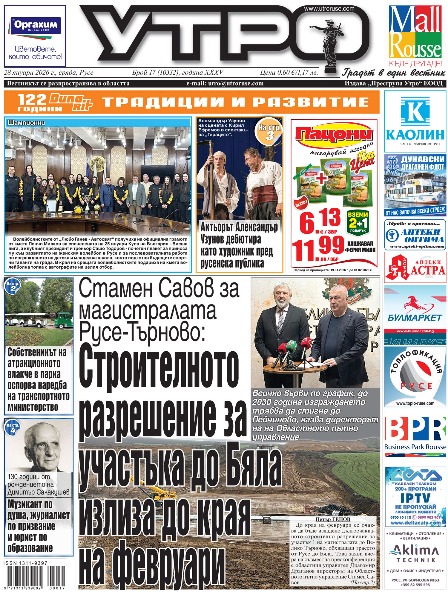 28 януари 2026 г. - Стамен Савов за магистралата Русе-Търново: Строителното разрешение за участъка до Бяла излиза до края на февруари * Собственикът на атракционното влакче в парка оспорва наредба на транспортното министерство * Скулптурата излезе на открито - Симеоновата къща в Русе се превърна в ново пространство за среща между изкуство и архитектура * Актьорът Александър Узунов дебютира като художник пред русенска публика * Реките на времето, които пренасят душевното богатство на една изгубена България в днешното безчестно време * 315 ученици в 20 различни специалности в Русенско вече се обучават чрез работа * Международен ден в памет на жертвите от Холокоста - Единствената държава, в която евреите са повече след войната, е България * 130 години от рождението на Димитър Сакакушев - Музикант по душа, журналист по призвание и юрист по образование * Ах, тези анкети! Без Росенов и Янева във финала на националната класация * „Дунав“ и „Етър“ в контрола със заряд на дерби днес на стадион „Ивайло“ * Тези и още новини в новия брой на „УТРО“.