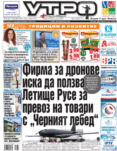 30 януари 2026 г. - Фирма за дронове иска да ползва Летище Русе за превоз на товари с „Черният лебед“ * Росица Георгиева защити с притча бъдещия паметник на партиарх Неофит в Русе: Споменът за праведника ще пребъде благословен, а името на нечестивците ще остане омразно * Проверяват договора за отдаване на морската почивна база „Просвещение“ * Осем дефибрилатора ще спасяват живот на ключови места в Русе * Нови цени за платено паркиране в Русе, оборудват с бодикамери служителите * Световната звезда в авиомоделизма и петкратен Приложник N1 на Русе змс Елеонора Павлова: Три неща не са се случвали в историята на авиомоделизма. Пожелавам си да успея да достигна поне едното от трите * Велиян Делийски: Поредното „То нищо не се случва в Русе, брат“ роди проекта „Русе на Дунава“ * От Русе до Кан, Венеция и Сейнт Мориц - Най-старото модно списание в света проследява пътя на младата русенска дизайнерка Лора Лилова * Кинцуги. Kогато раните ни се превръщат в злато * Чиликов: Головете ни на „Ивайло“ бяха супер, но допуснахме и две твърде леки попадения * Тези и още новини в новия брой на „УТРО“.