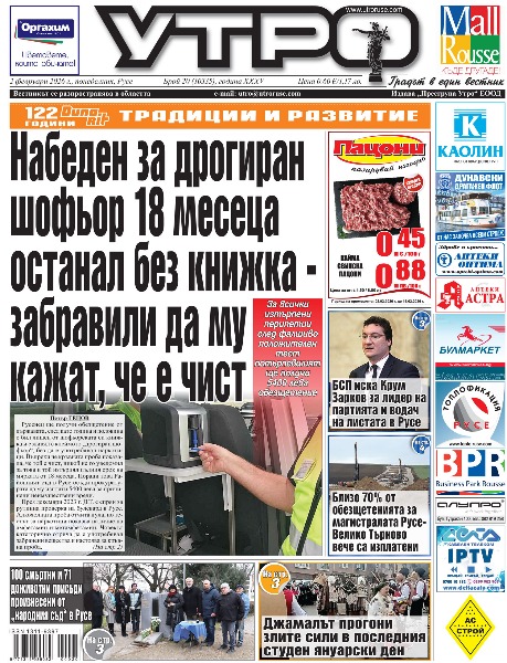 2 февруари 2026 г. - Набеден за дрогиран шофьор 18 месеца останал без книжка - забравили да му кажат, че е чист * БСП иска Крум Зарков за лидер на партията и водач на листата в Русе * 100 смъртни и 71 доживотни присъди произнесени от „народния съд“ в Русе * Извънредна общинска сесия спасява три важни за Русе проекта * Близо 70% от обезщетенията за магистралата Русе-Велико Търново вече са изплатени * Зорница Каменова е селекционер на конкурса за млад театрален режисьор „Слави Шкаров“ * Джамалът прогони злите сили в последния студен януарски ден * ВМРО плаши с блокади заради планиран мигрантски център в Сеново * „Любовен трепет“ в Русенската опера - музикален празник за Деня на влюбените * Млада поетеса дебютира пред Дървото на влюбените в Русе * Джамалът прогони злите сили в последния студен януарски ден * „Дунав“ загуби с 1:3 равна като игра контрола срещу ЦСКА * Тези и още новини в новия брой на „УТРО“.