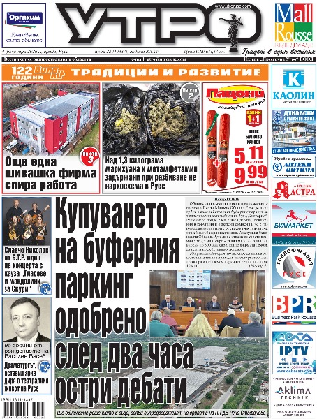 4 февруари 2026 г. - Купуването на буферния паркинг одобрено след два часа остри дебати * Още една шивашка фирма спира работа * Над 1,3 килограма марихуана и метамфетамин задържани при разбиване не наркосхема в Русе * „Мастилени мостове“ свързват изкуство, технологии и публика в „Блок 14“ * Славчо Николов от Б.Т.Р. идва на концерта с кауза „Гласове и мандолини за Скури“ * 95 години от рождението на Василен Васев - Драматургът, оставил ярка диря в театралния живот на Русе * Ученици учат връстници как да се пазят от онлайн опасности * 240 000 допълнително общинско финансиране за ремонта на бившия Дом на учителя * Мулета на телефонни измамници хванати на Дунав мост с измъкнати за „операция“ 2000 евро * 9 сантиметра сняг зачеркнаха контролата на „Дунав“ срещу исперихския „Бенковски“ * Вальо Ангелов прелетя над 60-те с уважение от спортната общественост * Тези и още новини в новия брой на „УТРО“.