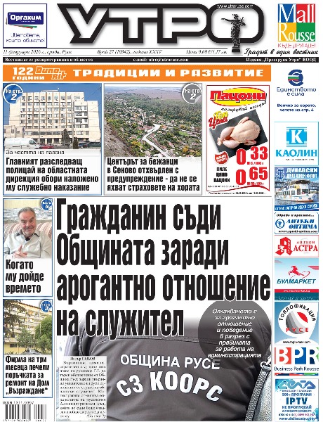 11 февруари 2026 г. - Гражданин съди Общината заради арогантно отношение на служител * За честта на пагона - Главният разследващ полицай на областната дирекция обори наложено му служебно наказание * Фирма на три месеца печели поръчката за ремонт на Дом „Възраждане“ * Центърът за бежанци в Сеново отхвърлен с предупреждение - да не се яхват страховете на хората * „18+“ - среща без алиби с тялото и желанието * Когато му дойде времето * Млада писателка развълнува невролозите от „Медика“ със стихове, писани в болничната стая * Началникът на просветното управление с отличие от областния управител * Петиция и подписка се обявиха против сделката с буферния тир паркинг * Куриери хванати с пари и злато на път към база на телефонни измамници в Гюргево * Новите „дракони“ с картотеки за мач срещу плевенчани * Тези и още новини в новия брой на „УТРО“.