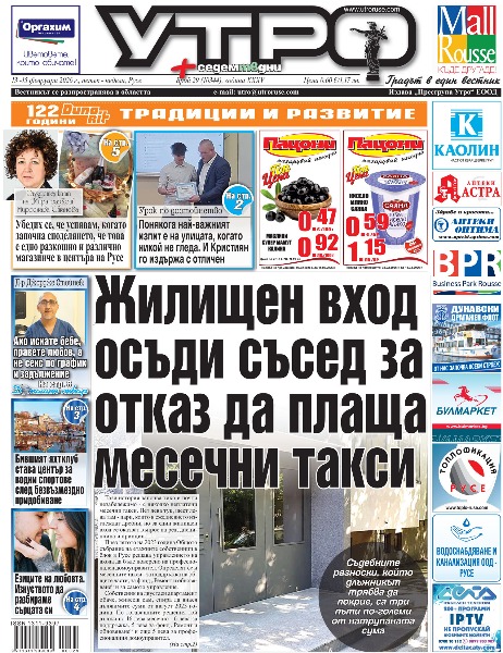 13 февруари 2026 г. - Жилищен вход осъди съсед за отказ да плаща месечни такси * Урок по достойнство - Понякога най-важният изпит е на улицата, когато никой не гледа. И Кристиян го издържа с отличен * Очното отделение в „Канев“ посреща 80-а годишнина с нова база и най-съвременна апаратура * „Медика“ разширява възможностите за лечение на болка с привличането на проф. Пламен Божинов * Д-р Стоян Стоянов с нов мандат начело на „Медицински център 1“ * Създателката на „Мира разКош“ Мирослава Станева: Убедих се, че успявам, когато започна споделянето, че това е едно разкошно и различно магазинче в центъра на Русе * Езиците на любовта. Изкуството да разбираме сърцата си * Бившият яхтклуб става център за водни спортове след безвъзмездно придобиване * Учители канят на неповторим концерт „Диалогът Моцарт-Шостакович“ в зала „Русе“ * Съветници предлагат 3 минути лимит за изказвания на кмета и администрацията * Годината на Червения огнен кон - пълен китайски хороскоп * Чиликов: Мотивацията е налице, отбор като „Спартак“ не е за подценяване * Тези и още новини в новия брой на „УТРО“.