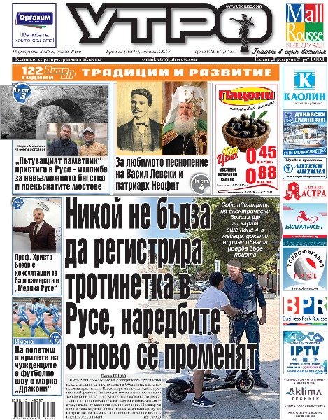 18 февруари 2026 г. - Шест години чакане за справедливост - Близки на загинали в катастрофа деца с отворено писмо след отложено дело * Сметките за ток през февруари до 25% по-високи спрямо миналата година * Шофьор осъди полицията за отнета заради чужда грешка регистрация * „Българийо, обичам те синовно“ - Русе отбелязва 148 години от Освобождението * Общинският бюджет спасява с 1,38 млн. евро заем санирането на четири блока в Русе * Метаболизъм на мечтите - Три вдъхновяващи жени говорят за успеха и промяната в годината на Огнения кон * „Наполетано“ идва в Русе - трогателна среща със свободата и приятелството * Дългият път от църковния салон до премиерата на „Евгений Онегин“ * Изложба в Доходното здание показва изкуството да бъдеш щастлив * Броят на заболелите от грип и остри респираторни заболявания трайно спада * Богата колекция иманярски находки конфискувана от частен дом във Ветово * Чиликов след изразителната победа над „Спартак“ /Пл/: Първо полувреме на приливи и отливи, прекрасни втори 45 минути, 4 гола по учебник * Тези и още новини в новия брой на „УТРО“.