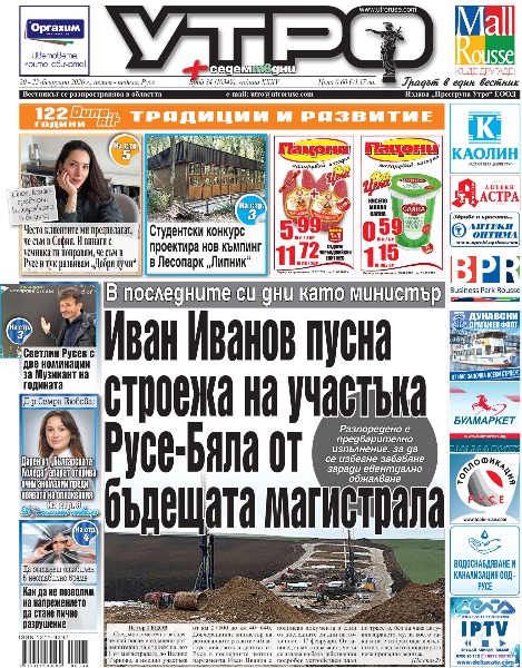 20 февруари 2026 г. - В последните си дни като министър - Иван Иванов пусна строежа на участъка Русе-Бяла от бъдещата магистрала * Студентски конкурс проектира нов къмпинг в лесопарк „Липник“ * Светлин Русев с две номинации за Музикант на годината * Общината и Енергото спорят чий е падналият стълб, смазал кола * Дара, която превърна калиграфията в бизнес: Често клиентите ми предполагат, че съм в София. И винаги с усмивка ги поправям, че съм в Русе и тук развивам „Добри думи“ * 50 000 евро заем от общинския бюджет задвижват рибарска група Русе-Иваново-Борово * Да останеш стабилен в нестабилно време * Как да не позволим на напрежението да стане лично разрушение * Прощавай. Простено! Малко Враново кани всички на Сирни Заговезни * Румен Петков защити решението за купуването на тир паркинга до Дунав мост * Страничните ефекти на видеорегистратора * Подсвирквате ли си в колата? Чудесно, може да ви слушат на другата улица. Или на другия край на света * „Дунав“ излиза в неделя в Драгалевци за двубой с голям залог с ЦСКА II * Тези и още новини в новия брой на „УТРО“.
