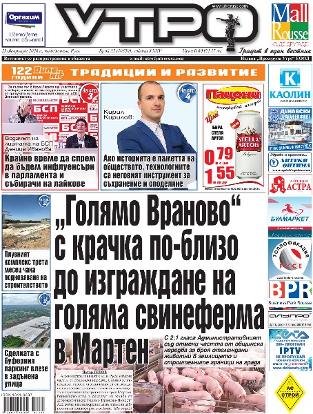 23 февруари 2026 г. - Плувният комплекс трети месец чака подновяване на строителството * „Голямо Враново“ с крачка по-близо до изграждане на голяма свинеферма в Мартен * Водачът на листата на БСП Деница Иванова: Крайно време да спрем да бъдем инфлуенсъри в парламента и събирачи на лайкове * 148 години от Освобождението на Русе Свободата не е подпис върху един документ. Предците не са чакали по-добри времена, а са ги създавали * Кирил Кирилов: Ако историята е паметта на обществото, технологиите са неговият инструмент за съхранение и споделяне * Председателското място предизвестено спъна избора на Районна избирателна комисия * Сделката с буферния паркинг влезе в задънена улица * Съветниците от ПП-ДБ с три препоръки към русенските депутати * Топенето на снега и изпускането на язовири качват нивата на реките, опасност за хората няма * Сирни Заговезни събра поколенията около Дървото на прошката в Ценово * Сговорна дружина почисти терена на Градския за мача срещу „Вихрен“ * Тези и още новини в новия брой на „УТРО“.