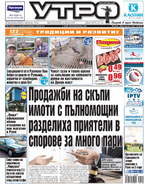 24 февруари 2026 г. - Продажби на скъпи имоти с пълномощни разделиха приятели в спорове за много пари * „Лидл“ официално обяви отваряне на нов магазин в Русе * Чакат сухо и топло време за запълване на зейналите дупки по настилката на Дунав мост * Доц. Йордан Кошев от Института по биоразнообразие-БАН: Завърналите се в Русенски Лом бобри са дошли от Румъния, вероятно от освободени животни в река Олт * Мартен преживя 76 прекъсвания на тока за три месеца * Връчването на Самарското знаме оживява в Русе на 3 март * Оборудват с нов модул системата за контрол на качеството на въздуха * Собственик на класически „Мерцедес“ извоюва над 2.5 пъти по-високо обезщетение след катастрофа * „Марек“ шокира „Фратрия“ с реми във Варна, „Дунав“ със 7 точки аванс при 2 мача в запас * Тези и още новини в новия брой на „УТРО“.