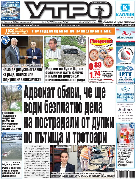 26 февруари 2026 г. - Адвокат обяви, че ще води безплатно дела на пострадали от дупки по пътища и тротоари * Мартен на бунт: Ще се обединим като юмрук и няма да допуснем свинекомплекс в града * Новият областен управител Орлин Пенков: Няма да допусна огъване на ръце, натиск или задкулисни зависимости * РИОСВ: Тъмните води по пътя за Николово не са от сметището * Два флага, една река - Русе и Гюргево готвят воден спектакъл под Дунав мост * „Медика“ започва надграждащи обучения на лекарски асистенти * Нина Найденова преди премиерата на „Риголето“: В творбата е вплетен протестен крясък срещу това, което кара човека да бъде такъв, какъвто етикет другите му слагат * Русе с футболен национал от... столичния „Левски“ * Тези и още новини в новия брой на „УТРО“.