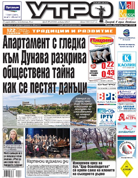 16 март 2026 г. - Апартамент с гледка към Дунава разкрива обществена тайна как се пестят данъци * Изкоренен орех на бул.“Цар Освободител“ се крепи само на клоните на съседното дърво * 164 милиона лева инвестиции в Русе по Плана за интегрирано развитие * БСП-Обединена левица за пръв път от години само с местни хора в листата * Общински съветник със седем въпроса за бомбоубежищата към областния управител * Водачът на листата на БСП-Обединена левица Деница Иванова: Моята амбиция не е да обещавам лесни решения, а Русе да има силен глас в Народното събрание * ДПС с познат водач на листата - Атидже Алиева-Вели * 44% от битовите отпадъци се рециклират и оползотворяват * Десетки деца засадиха дръвчета на кея, с които винаги ще се гордеят * Младите гвардейци се строяват в памет на саможертвата на Ангел Кънчев * „Нашенци“ представиха Северна България на Празника на Ямболското хоро * Нов късен гол осигури на „Дунав“ почти сигурно завръщане в Първа лига * Георги Чиликов: Късметът обича силните. Не е моментът за коментари кой какво пише по мой адрес * Тези и още новини в новия брой на „УТРО“.