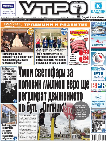 24 март 2026 г. - Умни светофари за половин милион евро ще регулират движението по бул. „Липник“ * Дизайнери от два континента ще представят колекции в Седмицата на модата в Русе * Пенчо Милков на откриването на новия корпус на „Васил Левски“: Това е доказателство, че когато една общност вярва в образованието, инвестира в смисъл, в посока и в шанс * След 18 години в грешка поправят предмета на дейност на „Общински пазари“ * Иво Пазарджиев предлага нов правилник за работата на русенския омбудсман * Иво Сиромахов представя в Русе „Story Nights“ - вечер за истории, хумор и разговор без филтър * Ученици от 9 училища в три европейски страни заявиха желанието на младостта за свобода * Училищата по изкуствата в Русе и Гюргево готвят партньорство и съвместни инициативи * Как се списва/преписва история на един град * ЦСКА II-“Дунав“ - предистория с „червени“ национали на хартия * Тези и още новини в новия брой на „УТРО“.